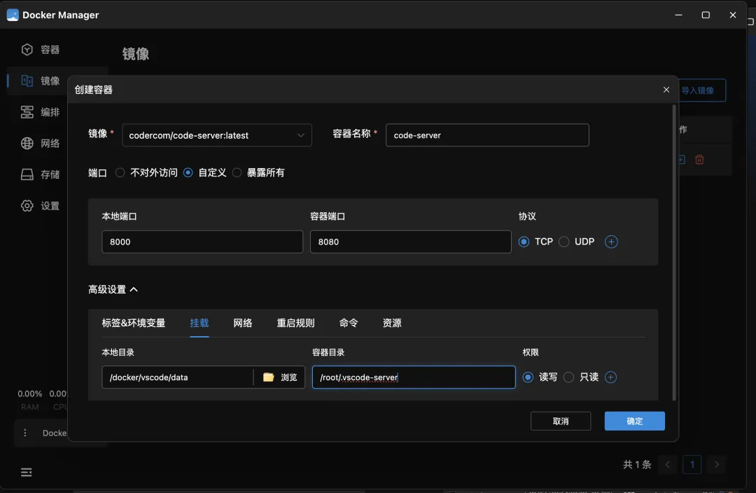 挂载:本地目录:/docker/vscode/data 容器目录:/root/.vscode-server