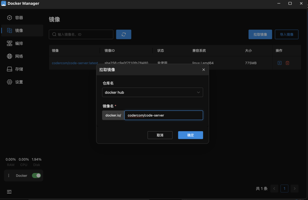 进入镜像模块,拉取镜像,输入:codercom/code-server,等待片刻后,点击操作+,构建容器