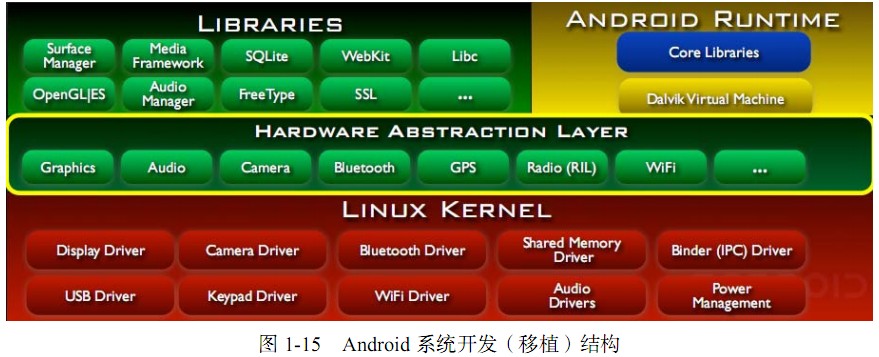 移植到其他的硬件平台,因此需要掌握 Android 系统构架中的 Linux 内核层和系统运行库层,如图 1-15