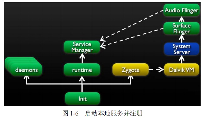 服务将注册到服务管理器(Service Manager)作为 IPC服务的目标, 如图 1-6所示。