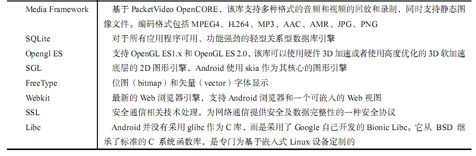 系统运行库层包括程序库和 Android 运行库两部分,下面分别来介绍这两个部分。