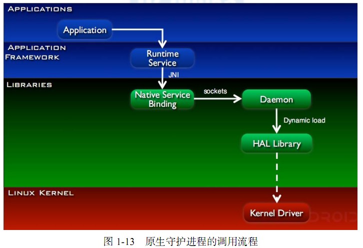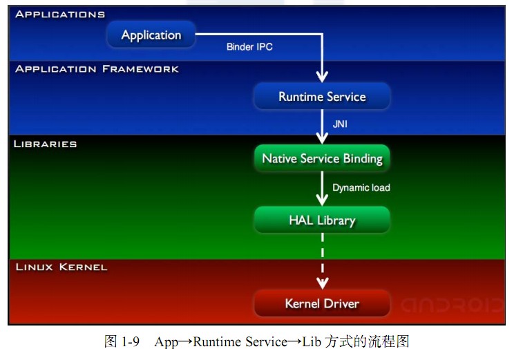 最后一种方式“App→Runtime Service→Native Daemon→Lib” ,如图 1-13所示。这种方式通常用于