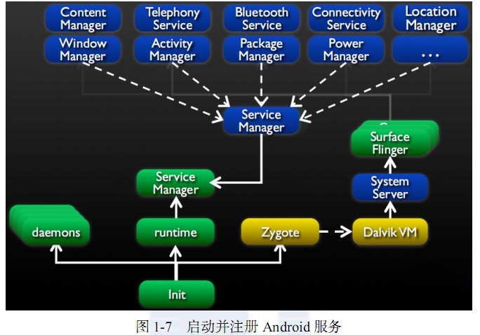 系统服务将启动 Android 管理服务,Android 管理服务将都被注册到服务管理器上,如图1-7 所示。