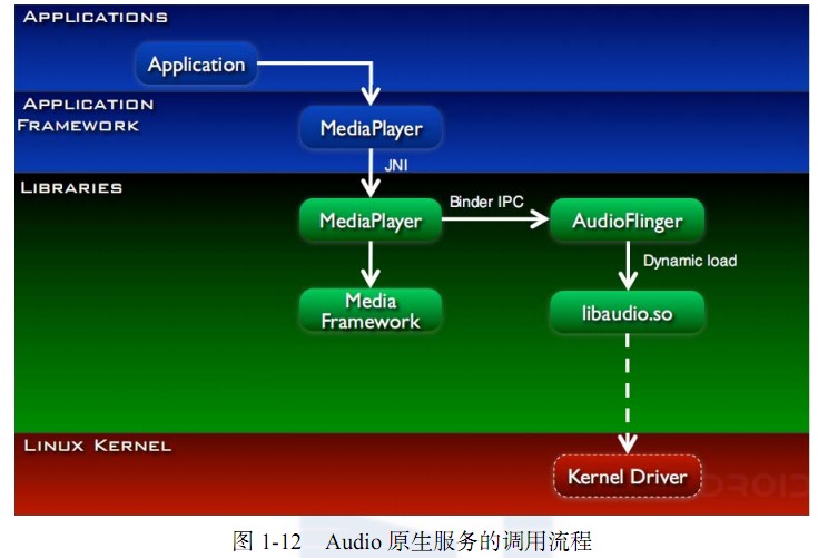 从图 1-12 可以看出,应用程序调用了应用程序框架层的 MediaPlayer,然后调用系统运行库层的