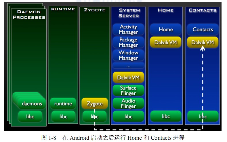 单独的进程。如图 1-8 所示,系统启动了一个 Home 进程和一个 Contacts 进程。那么,各个进程之间