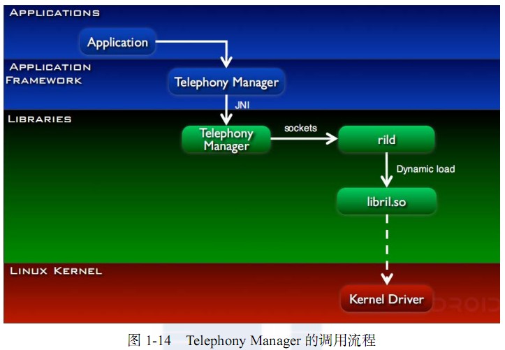 (Telephony Manager)的调用就是这样一个原生的守护进程调用,其流程如图 1-14 所示。