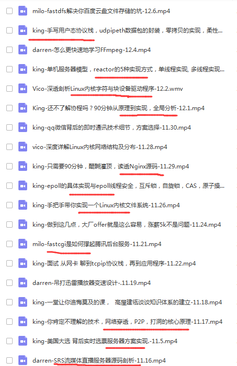 内容包括C/C++,Linux,Nginx,ZeroMQ,MySQL,Redis,MongoDB,ZK,流媒体,P2P,K8S,Docker,TCP/IP,协程,DPDK多个高级知识点。