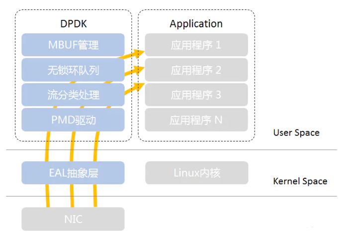 DPDK是Data Plane Development Kit的缩写。简单说,DPDK应用程序运行在操作系统的User Space,利用自身提供的数据面库进行收发包处理,绕过了Linux内核态协议栈,以提升报文处理效率。