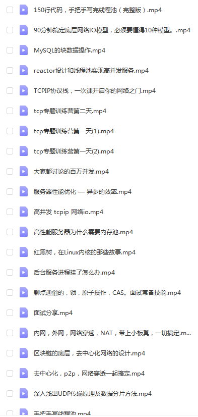 分享更多关于C/C++ Linux后端开发网络底层原理知识学习提升 学习资料,完善技术栈,内容知识点包括Linux,Nginx,ZeroMQ,MySQL,Redis,线程池,MongoDB,ZK,流媒体,音视频,Linux内核,CDN,P2P,epoll,Docker,TCP/IP,协程,DPDK等等。