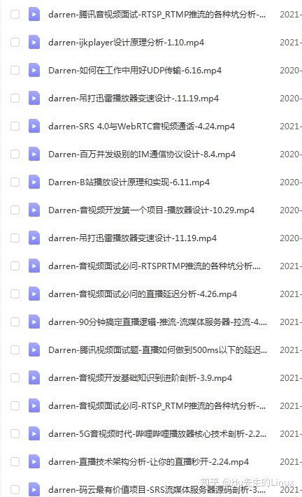 音视频流媒体高级开发知识点学习视频点击 音视频学习资料 获取。知识点包括有FFmpeg/WebRTC/RTMP/RTSP/HLS/播放器-音视频流媒体高级开发。