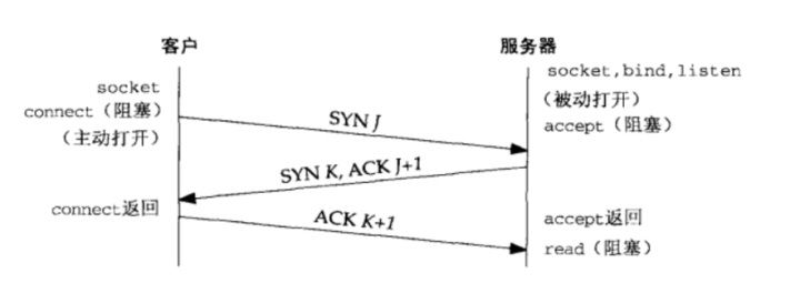 当客户端调用connect函数时,三次握手也随之发生,如图:
