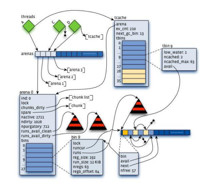 虚拟内存被逻辑上分割成 chunks(默认是4MB,1024个4k页),访问线程通过 round-robin 算法在第一次 malloc 的时候分配 arena,每个 arena 都是相互独立的,维护自己的 chunks, chunk 切割 pages 到 small/large 对象。free() 的内存总是返回到所属的 arena 中,而不管是哪个线程调用 free()。通过 arena 分配的时候需要对 arena bin(每个 small size-class 一个,细粒度)加锁,或 arena 本身加锁。并且线程 cache 对象也会通过垃圾回收指数退让算法返回到 arena 中。