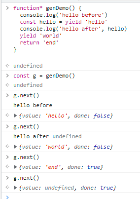 执行 genDemo 这个 Generator 函数,返回的 g 是一个指针。这个时候没有任何打印,函数体内代码没有执行。