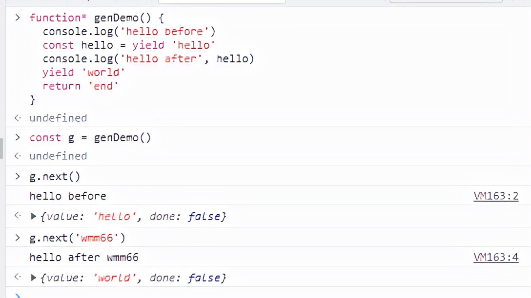 - 第二次执行 g.next 时,传一个参数 ’wmm66’,会先将这个传入的参数赋值给上一次暂停时 yield 前面要赋值的变量,即上面代码中的 hello 变量。赋值完成后再往下运行代码,运行到下一个 yield 处。