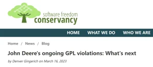 博文特别点名批评了 John Deere 公司,称其为 “特别恶劣的违规者”。Deere 的农业机器中部署最广泛的 GPL 软件是 Linux。 与大多数 Linux 发行版一样,Deere 机器内的 Linux 版本也使用 copyleft 许可下的几个程序,但其从未公开任何源代码。这导致农具出现软件层面的损坏时,农民无法自行修理,只能继续求助于农具制造商,或者购买新产品。