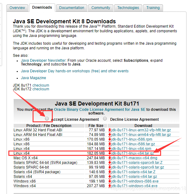 下载JDK:http://www.oracle.com/technetwork/java/javase/downloads/jdk8-downloads-2133151.html;本环境下载的是64位tar.gz包,将安装包拷贝至安装服务器/usr/local目录