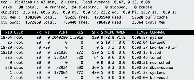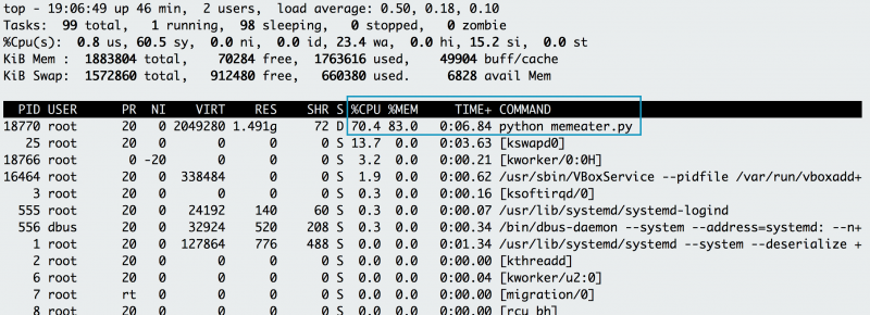 你的应用是否真的内存不足?要确认这个问题,可使用 top 来查看应用程序消耗多少 CPU 和内存。当使用 top 命令后,您注意到一个 Python 应用程序使用了大部分的 CPU,其内存使用量也迅速攀升。当它运行时,如果进程是你的应用程序,则按”C”键来查看完整命令并进行逆向工程。发现原来是你的内存密集型应用程序(memeater.py)。当你的应用程序已经用尽内存,系统会杀掉它并返回一个内存不足(OOM)的错误。