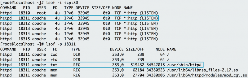Lsof 表明了 httpd 在 80 端口上侦听。检查 httpd 的进程ID还可以显示所有需要运行的文件httpd。