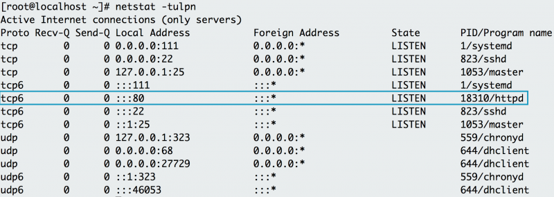 使用 netstat -tulpn 表明 Apache 已经在这台机器上使用了 80 端口。