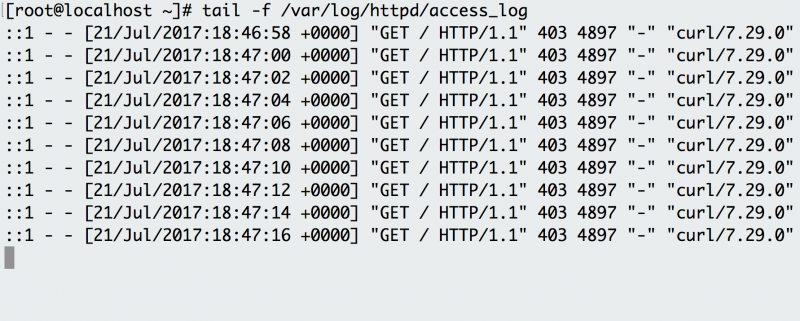-f 选项表示跟随的意思,它可在日志被写入文件时输出它们。下面的示例具有每隔几秒访问端点的后台脚本,日志会记录请求。除了实时跟踪日志,还可以使用 tail 带上 -n 选项来查看文件的最后 100 行。