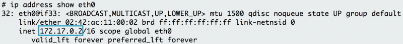 使用 ip address 显示 eth0 接口的 IP 地址为 172.17.0.2