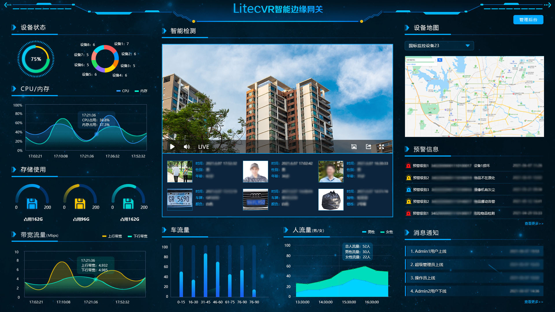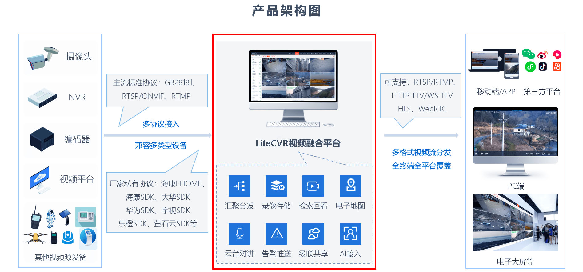 RTMP流媒体服务器LiteCVR为了顺应安防市场的规模不断扩大与发展,开发出了具有强大的数据接入、处理及分发能力,除此之外还具有兼容性强、灵活拓展度强、安装部署设施轻松等特点,平台支持海量视频汇聚管理,可提供视频监控直播、云端录像、云存储、录像检索与回看、智能告警、平台级联、语音对讲、智能分析等相应功能。适用于许多场景,例如:智慧工地、智慧校园、智慧社区、智慧楼宇。