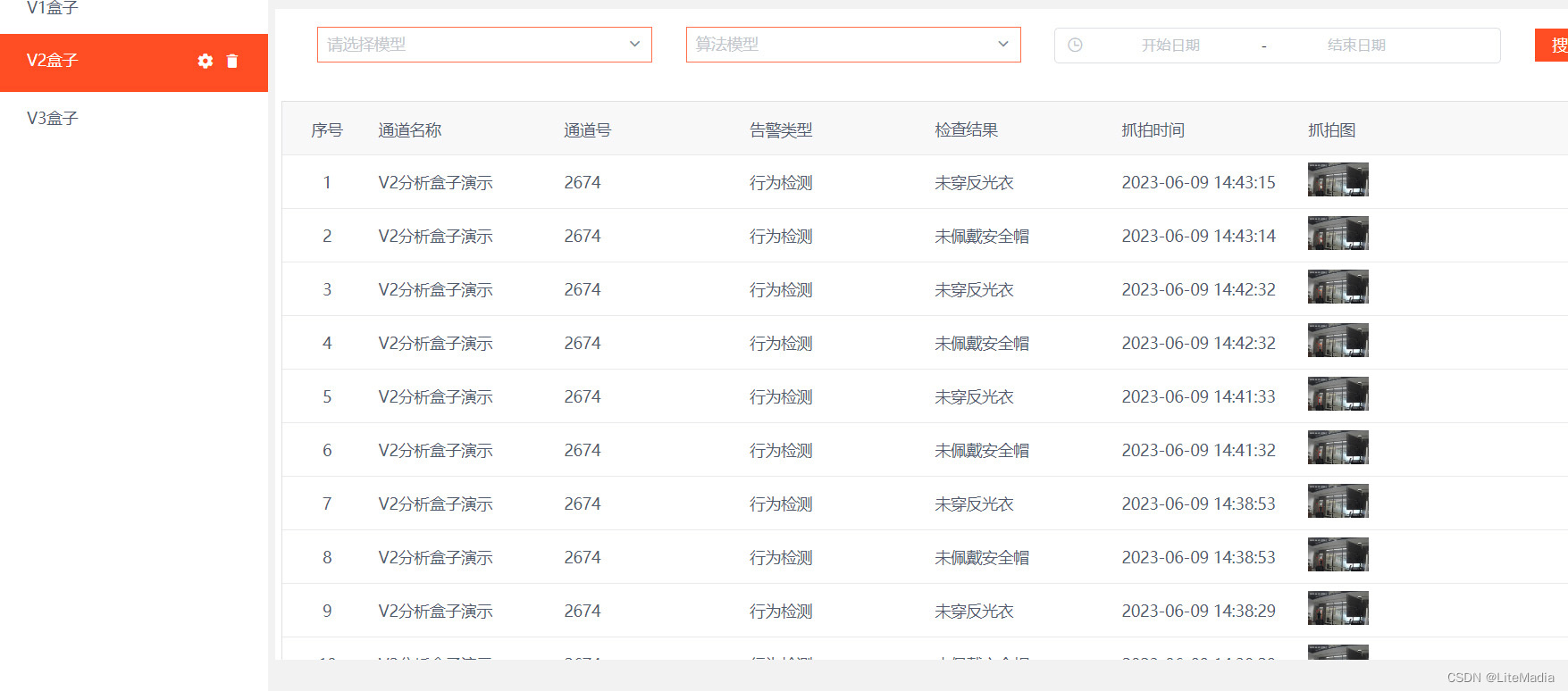 配置完成后,在LiteCVR平台上即可看到V2盒子的分析结果。请注意,在添加完成后,需要刷新页面并点击编辑按钮,才能在盒子后台的http推送输入框中看到推送服务地址。