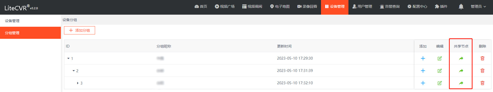 首先添加上级平台,再按需配置分组信息。配置完成后,可点击“共享节点”按钮进行推送。在“共享节点”页面,选择要推送的上级平台名称即可。推送成功后,上级平台会按照此组织结构展示,一级目录是添加上级平台时的“SIP认证使用者”名称或编码,二级以下目录则为配置的分组结构。