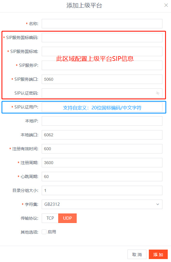 其中,“本地端口”为注册端口,应保持唯一性,服务器也需开放相应端口,可选择TCP/UDP协议。此外,若需填写中文的“SIP认证使用者”,需确保上级平台支持,否则仍以20位国标编码为准。