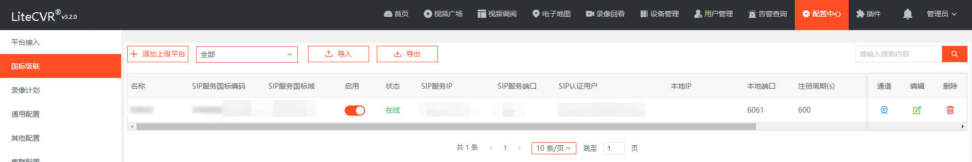 LiteCVR平台可以作为上级平台或下级平台,并支持同时级联多个上级平台。若作为上级平台,只需按设备接入方式配置下级平台的SIP信息即可。若作为下级平台,则需在“配置中心”-“国标级联”中添加上级平台。