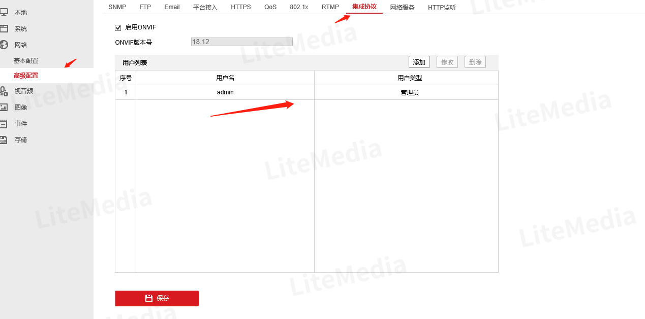 3)于是登录设备,找到集成协议,可以看到onvif配置里有账户配置,随后将账户密码和设备登录密码修改一致;