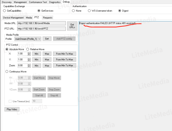 2)随后通过onvif工具测试,点击云台控制看到测试工具报401鉴权错误;