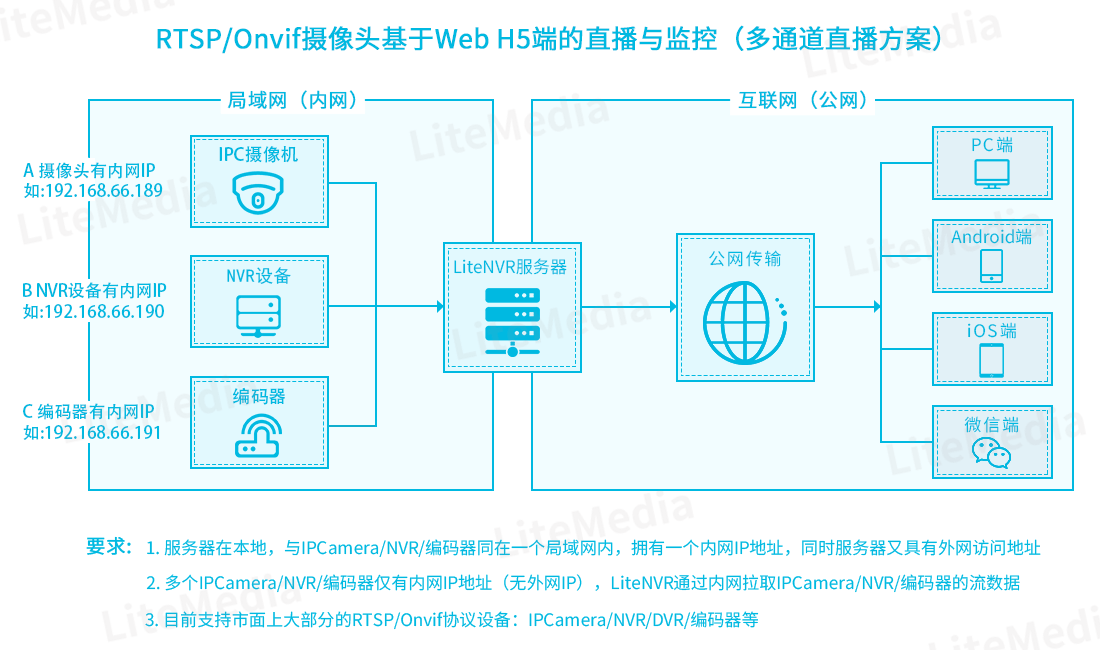 安防监控平台LiteNVR可支持设备通过RTSP/Onvif协议接入,并能对接入的视频流进行处理与多端分发,包括RTSP、RTMP、HTTP-FLV、WS-FLV、HLS、WebRTC等多种格式。在智慧安防等视频监控场景中,LiteNVR可提供视频实时监控直播、云端录像、云存储、录像检索与回看、告警等视频能力,极大满足行业的安防监控、无人值守等业务需求。