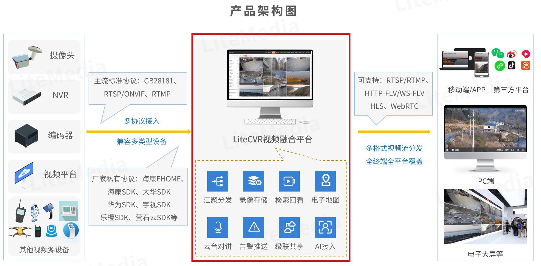 视频监控综合管理平台LiteCVR可以实现海量资源的接入、汇聚、计算、存储、处理等,平台具备轻量化接入能力,可支持多协议方式接入,包括主流标准协议GB28181、RTSP/Onvif、RTMP等,以及厂家私有协议与SDK接入,包括海康Ehome、海大宇等设备的SDK等。