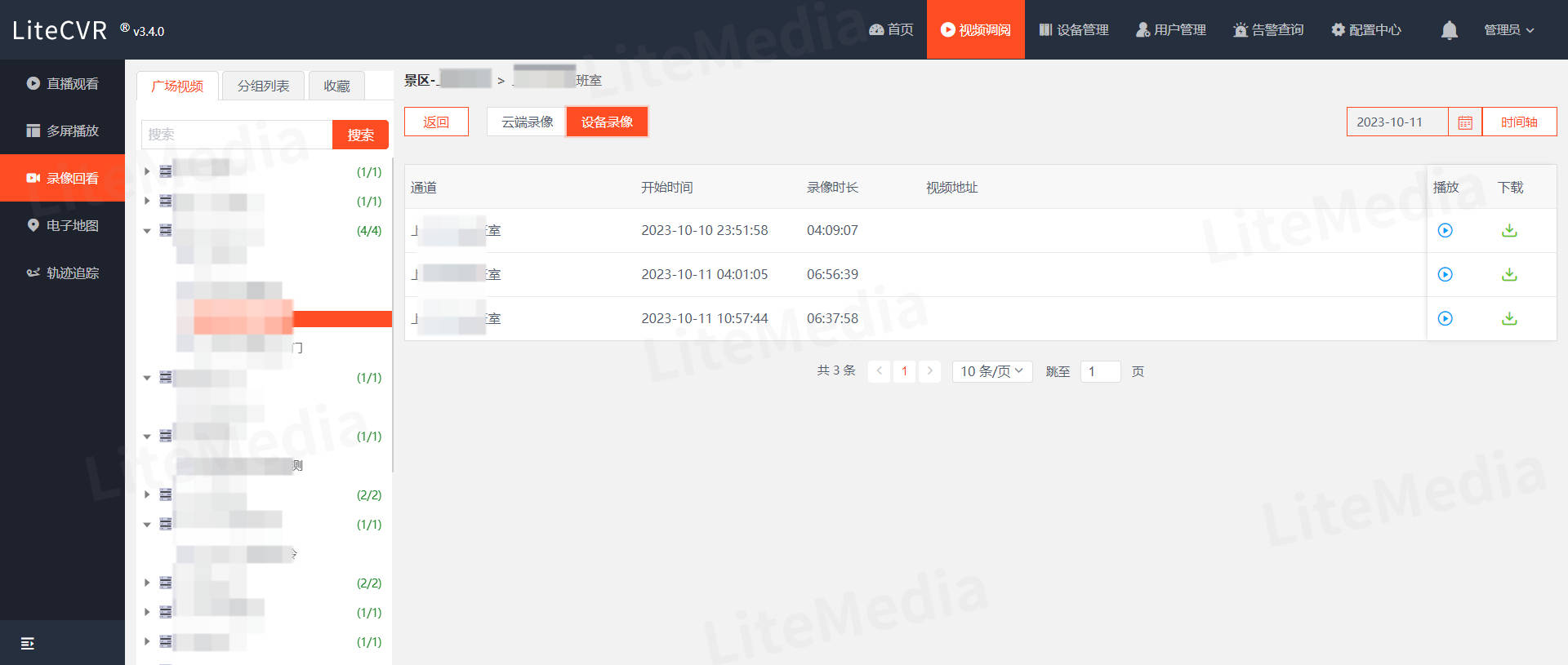 在视频监控综合管理LiteCVR平台【录像回看】-【查看通道】—【设备录像】中,即可访问通过GB28181国标协议、海康/大华SDK,以及海康ehome协议接入的设备录像,录像一般存储在设备的SD卡或硬盘录像机中,我们的开源视频监控综合管理平台LiteCVR平台可以下载成MP4格式到本地播放。