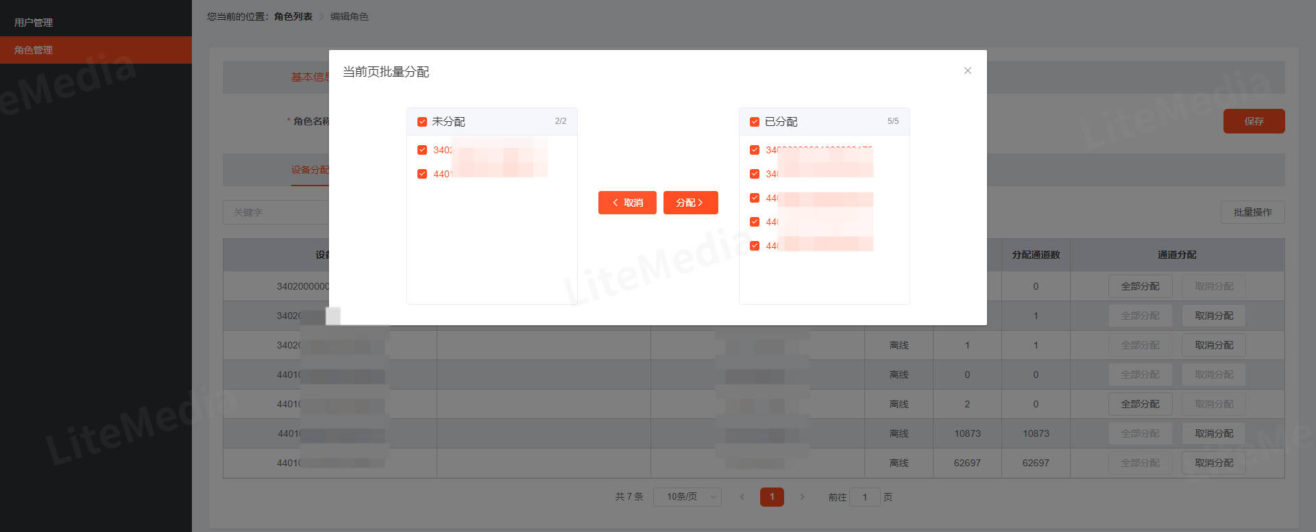 今天介绍一下LiteGBS新开发的角色批量绑定和取消设备功能。前端展现画面如下: