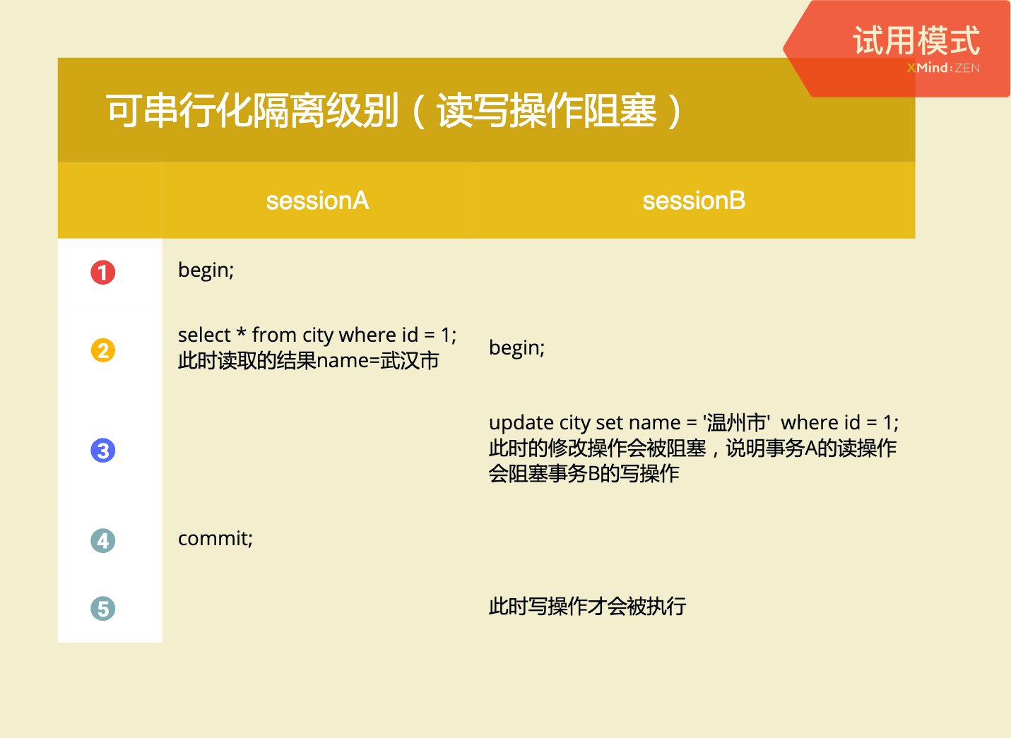 提问:为什么 session A事务修改数据,加了写锁,为什么别的事务还可以操作?因为 MVCC 多版本控制,有快照可以供其他事务读