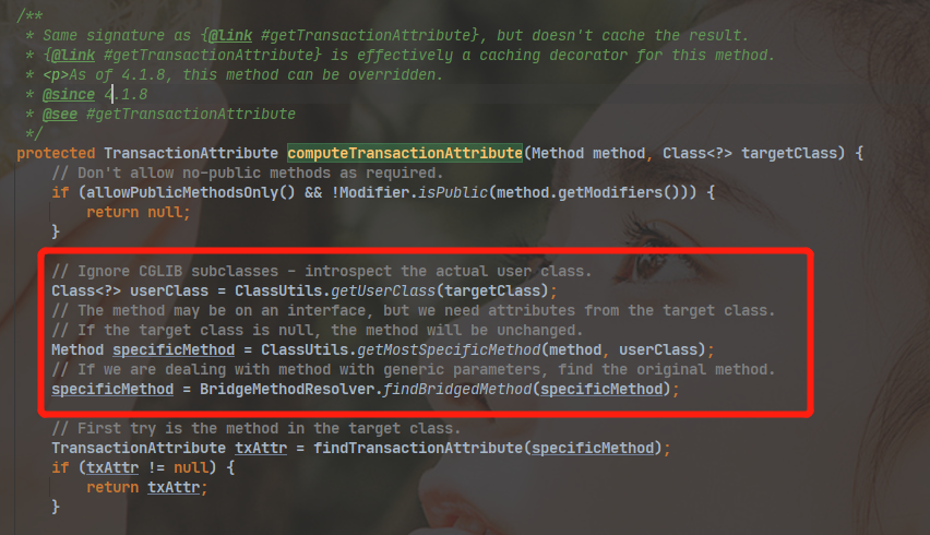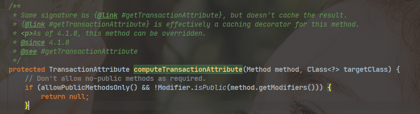 Java 的访问权限,主要有四种:private、default、protected 、public 权限从左往右,依次变大,如果事务方法,使用错误的访问权限,事务就会出现问题,spring-tx 的 jar 包 中 AbstractFallbackTransactionAttributeSource#computeTransactionAttribute() 方法,事务方法必须是 public 关键字修饰的访问权限,否则会返回 null,事务就会失效,所以事务方法访问权限是 private ,default ,protected 关键字修饰时,Spring不会提供事务功能