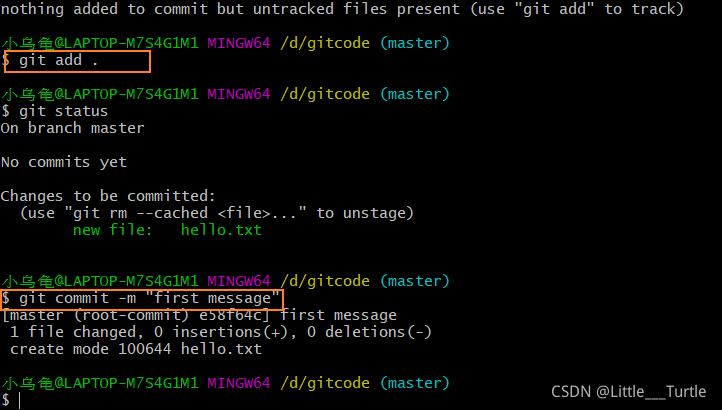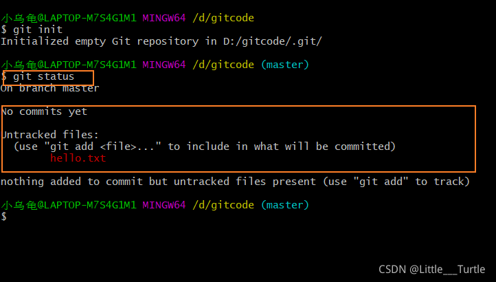 Untracked: 未跟踪, 此文件在文件夹中, 但并没有加入到git库, 不参与版本控制. 通过git add 状态变为Staged.