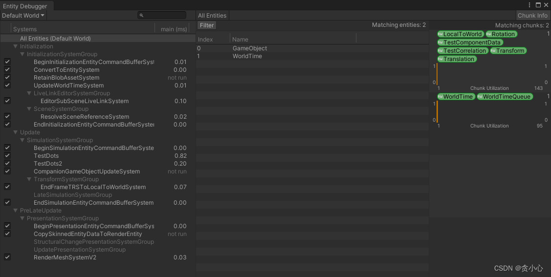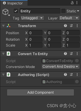 手动新建一个对象,给它添加一个ConvertToEntity脚本,运行后,会发对象在Hierarchy面板上消失了,我们打开EntityDebugger实体控制台可以看到我们消失的实体和它的组件信息
