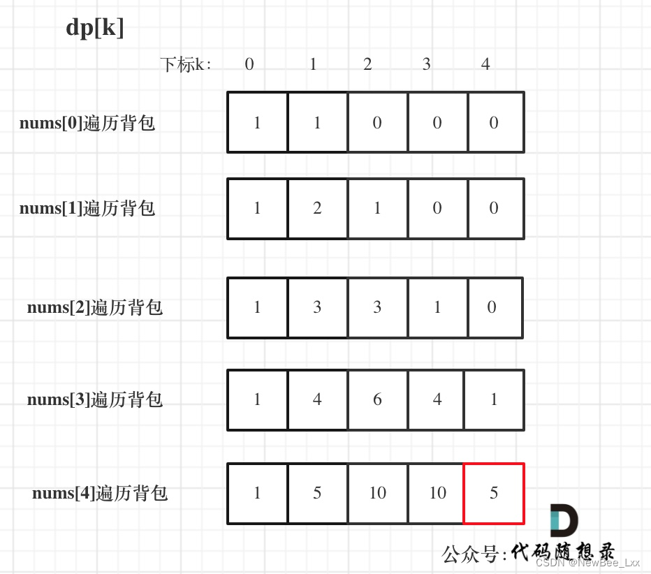 dp[j] 表示:填满j(包括j)这么大容积的包,有dp[j]种方法