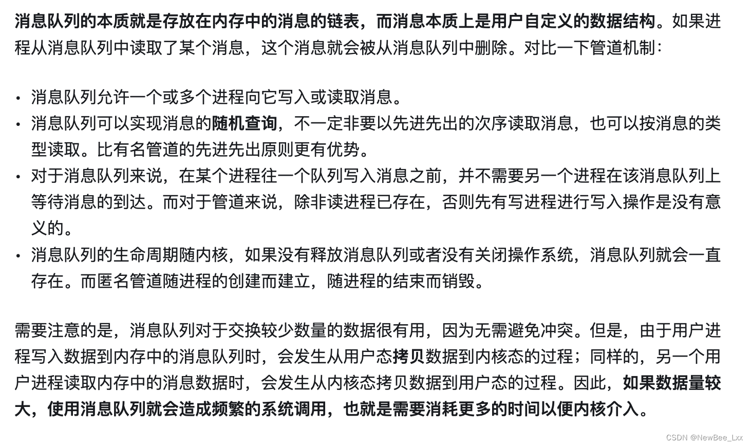 对于这个问题,消息队列的通信模式就可以解决。比如,A 进程要给 B 进程发送消息,A 进程把数据放在对应的消息队列后就可以正常返回了,B 进程需要的时候再去读取数据就可以了。同理,B 进程要给 A 进程发送消息也是如此。