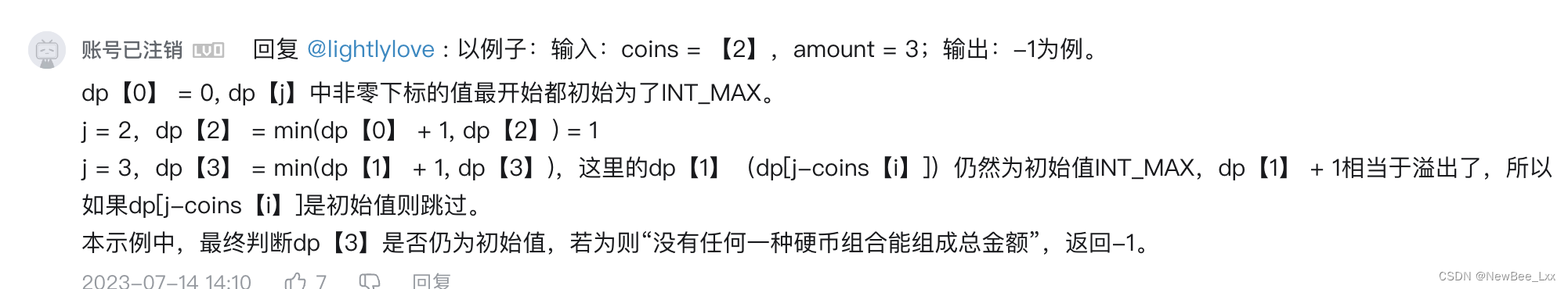 if (dp[j - coins[i]] != INT_MAX) { // 如果dp[j - coins[i]]是初始值则跳过