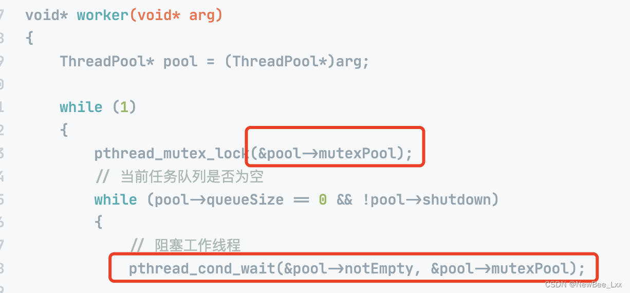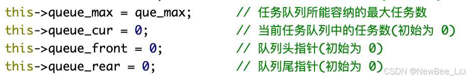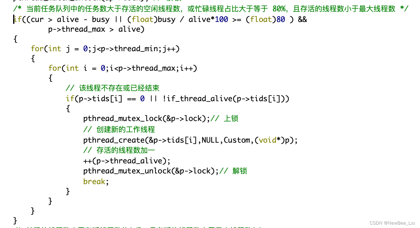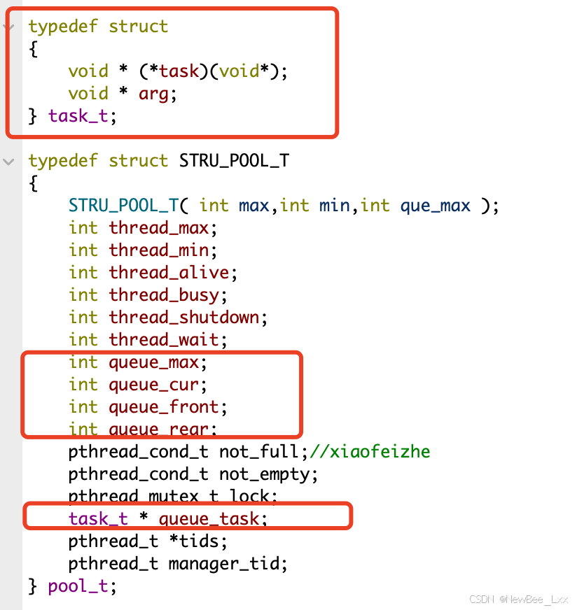 首先是自定义线程池结构体其中包括了最大最小线程数 存活的线程数 忙碌的线程数 线程池的关闭状态 需要等待关闭的线程数 任务队列所能容纳的最大任务数 当前队列的任务数 任务队列的头尾指针用来添加和拿取任务 初始化两个条件变量和一个锁 初始化工作线程数组和任务队列