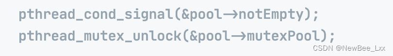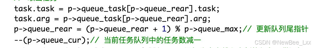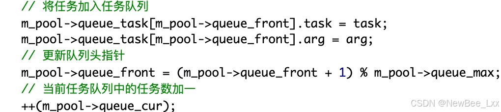 如果任务队列已满 就用pthread cond wait 等待任务队列有空余的地方 将任务添加到任务队列 用头指针 添加完任务就会更新头指针 使头指针指向的位置加一 这里用到了循环队列 指针加一 并且对任务队列的容量取余 这样即使指针指到最后还能走回到第一个位置 添加完任务就用条件变量 pthread cond signal 通知消费者线程有新的任务可以取 并解锁
