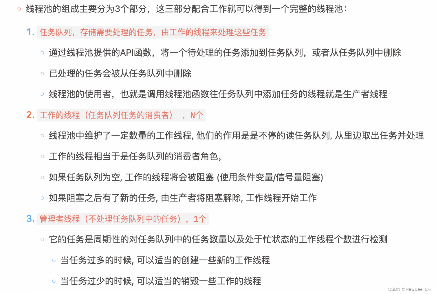 线程池主要采用生产者消费者模型,分为三部分 任务队列 工作的线程 (工作的线程有很多个) 管理者线程(一个)