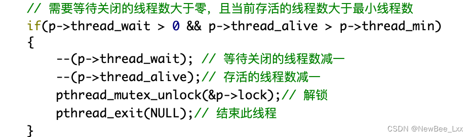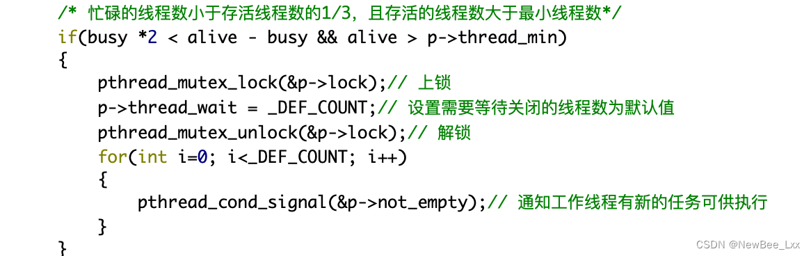 忙碌的线程小于存活的线程三分之一 存活的线程数大于最小线程数 就将需要关闭的线程数设置为默认值 并通知给工作线程的条件变量 让他去执行杀死线程的工作