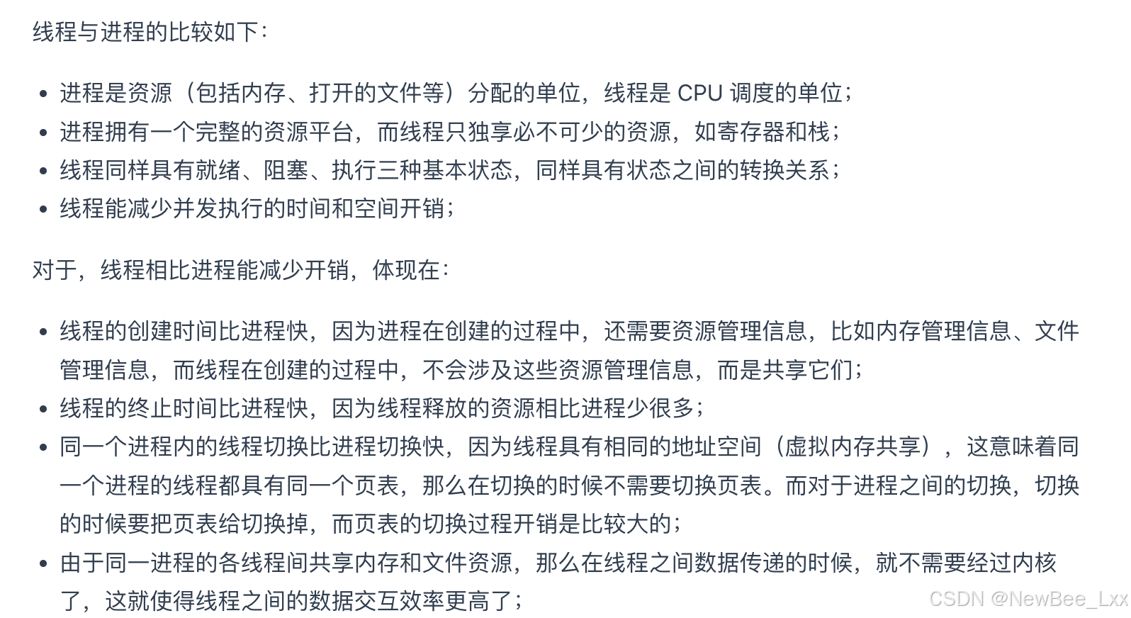 创建一个进程的开销更大 系统会为进程分配独立的地址空间 还需要维护数据段 堆栈段等资源