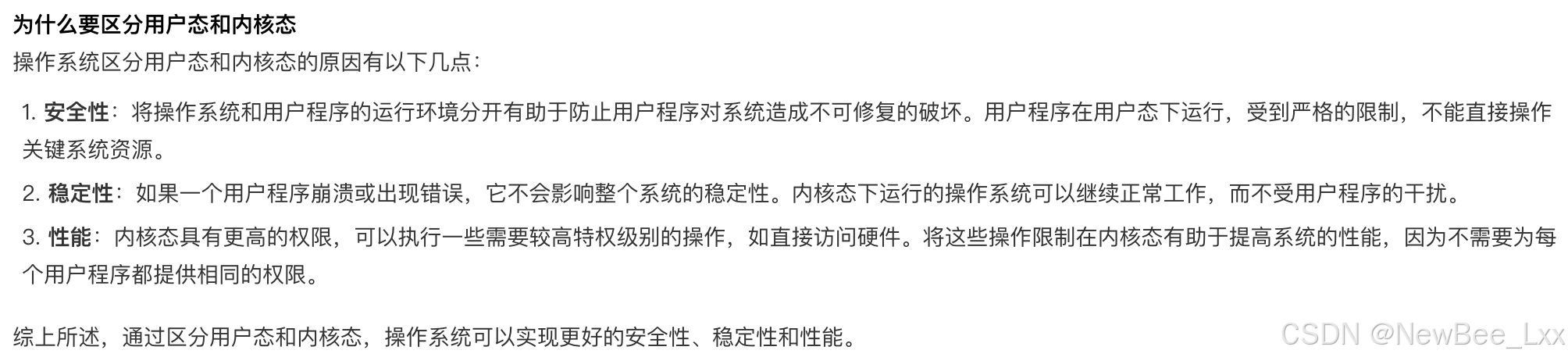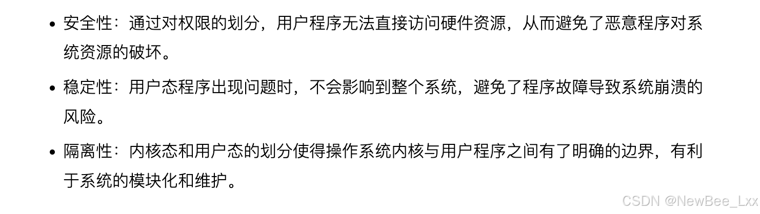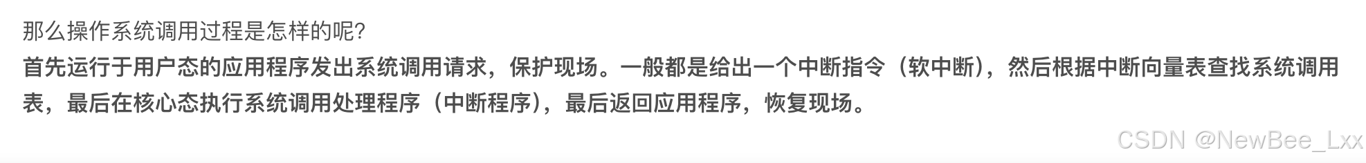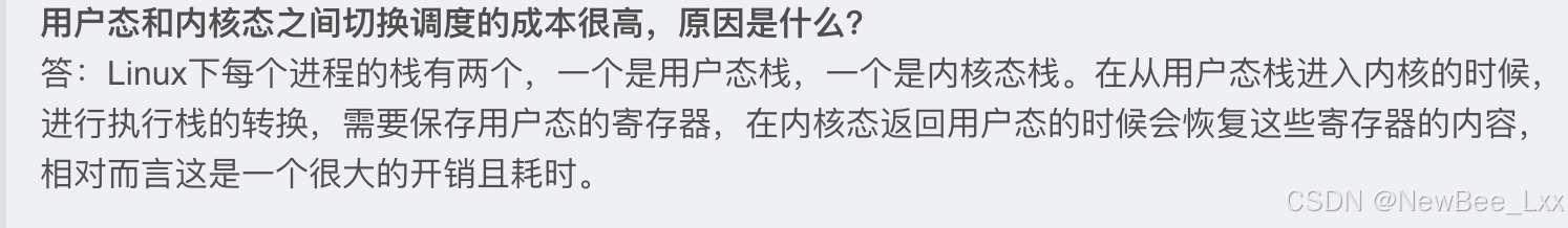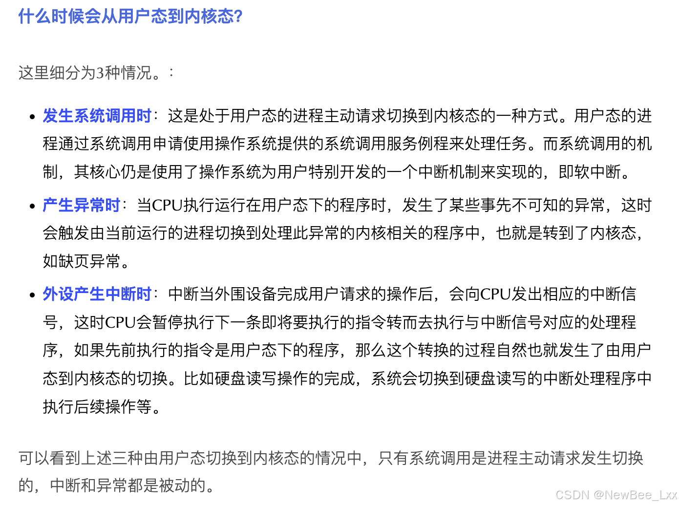 用户态只能受限的访问内存, 且不允许访问外设(硬盘、网卡等);在用户态下如果要进行文件操作、网络通信等都操作需要通过系统调用来实现。当应用程序发出系统调用时,会触发上下文切换,将CPU的控制权交给操作系统内核,进入内核态。