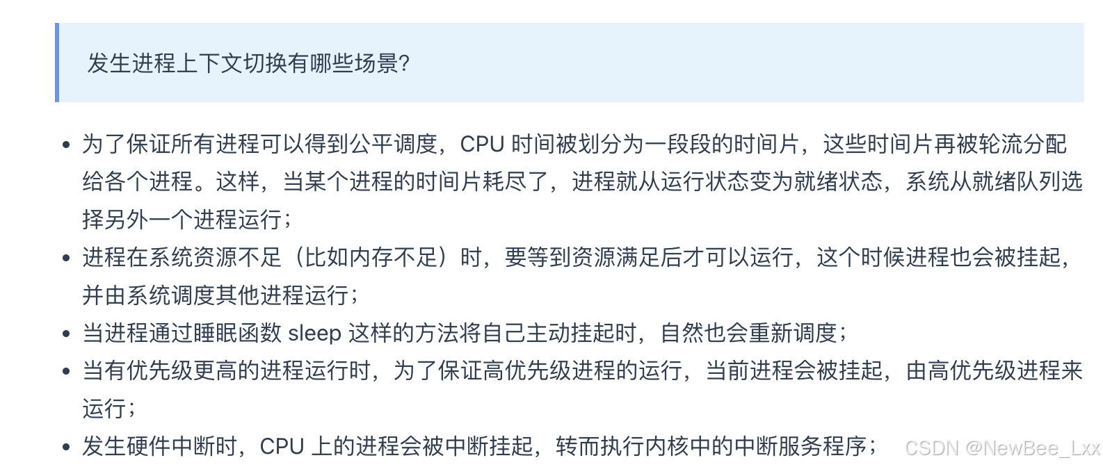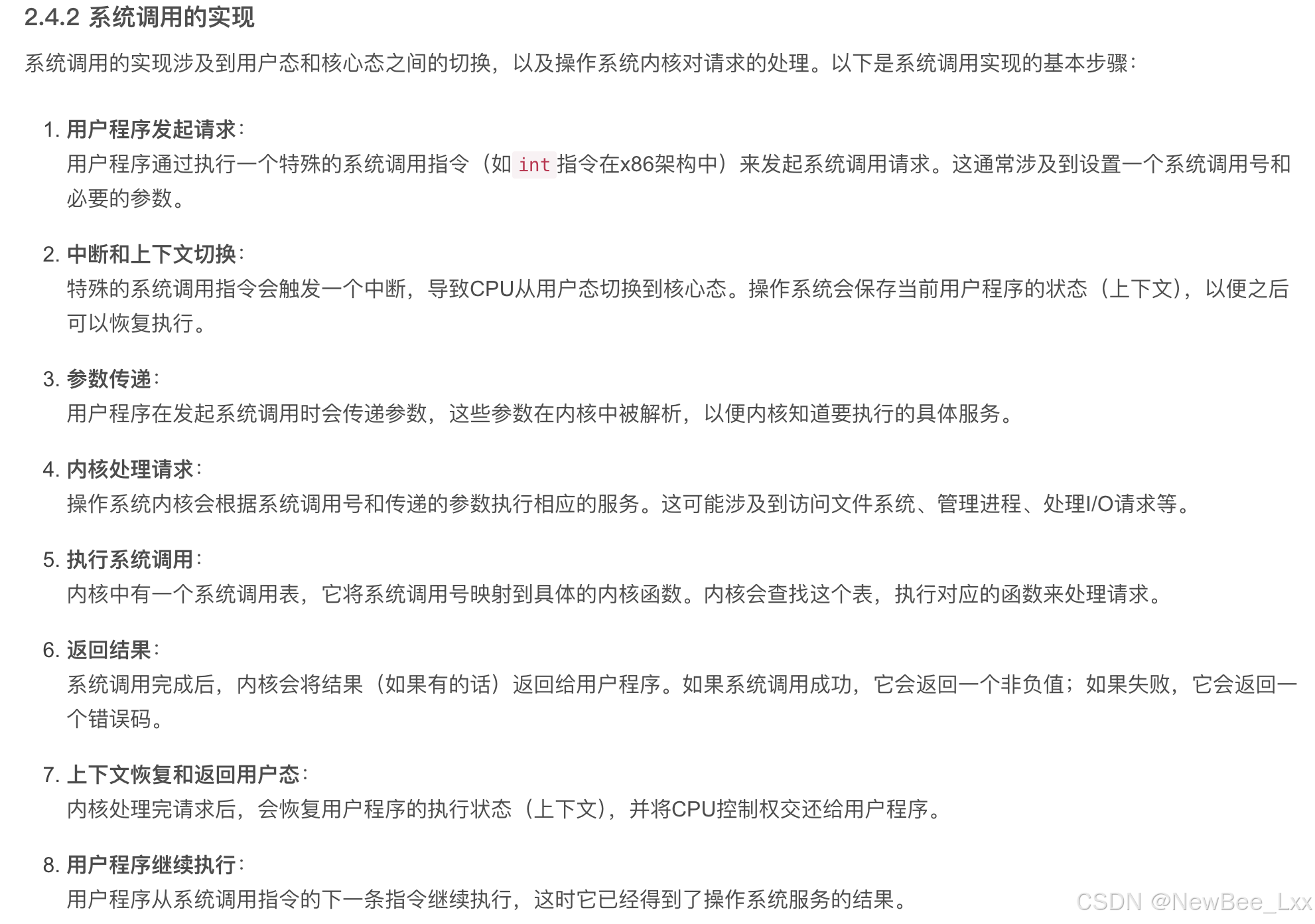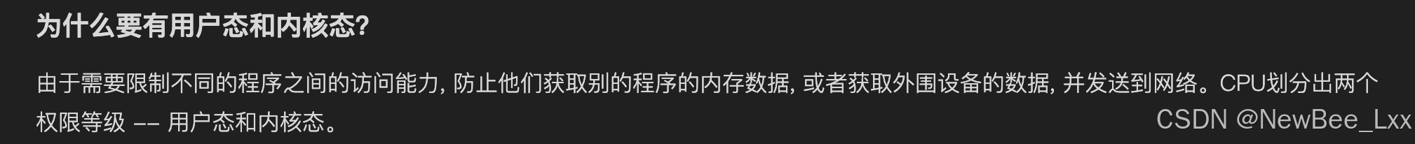 用户态只能受限的访问内存, 且不允许访问外设(硬盘、网卡等);在用户态下如果要进行文件操作、网络通信等都操作需要通过系统调用来实现。当应用程序发出系统调用时,会触发上下文切换,将CPU的控制权交给操作系统内核,进入内核态。